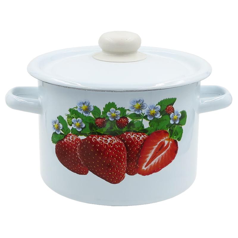 Potil on valge, sile emailkattega välispind ning  dekoratiivne motiiv maasikatega, mis annab sellele klassikalise ja ajatu välimuse.