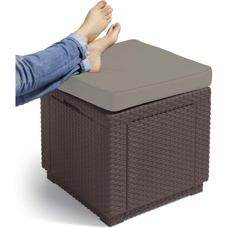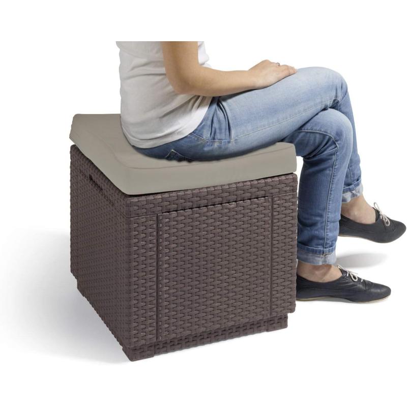 Kompaktne ja praktiline loodusliku rotangi imitatsiooniga hoiukast-iste Cube koos padjaga.
