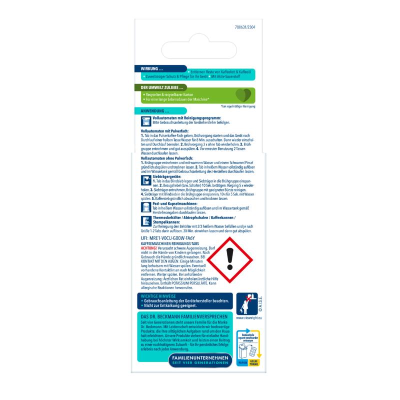 Dr.Beckmanni kohvimasina puhastustabletid eemaldavad ladestunud kohvirasvad ja -õlid, hooldab ja kaitseb kohvimasinat