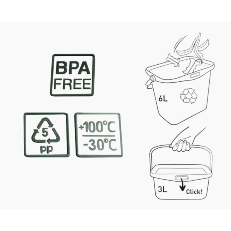 Ühelt küljelt on kaas püsivalt konteineri külge kinnitatud. Hingedega kaas muudab konteineri tühjendamise eriti mugavaks. Kaane sulgemisel püsivad ebameeldivad lõhnad konteineri sees ning köök jääb värskeks.