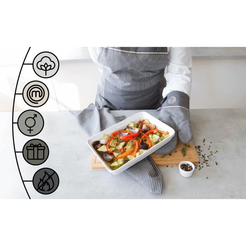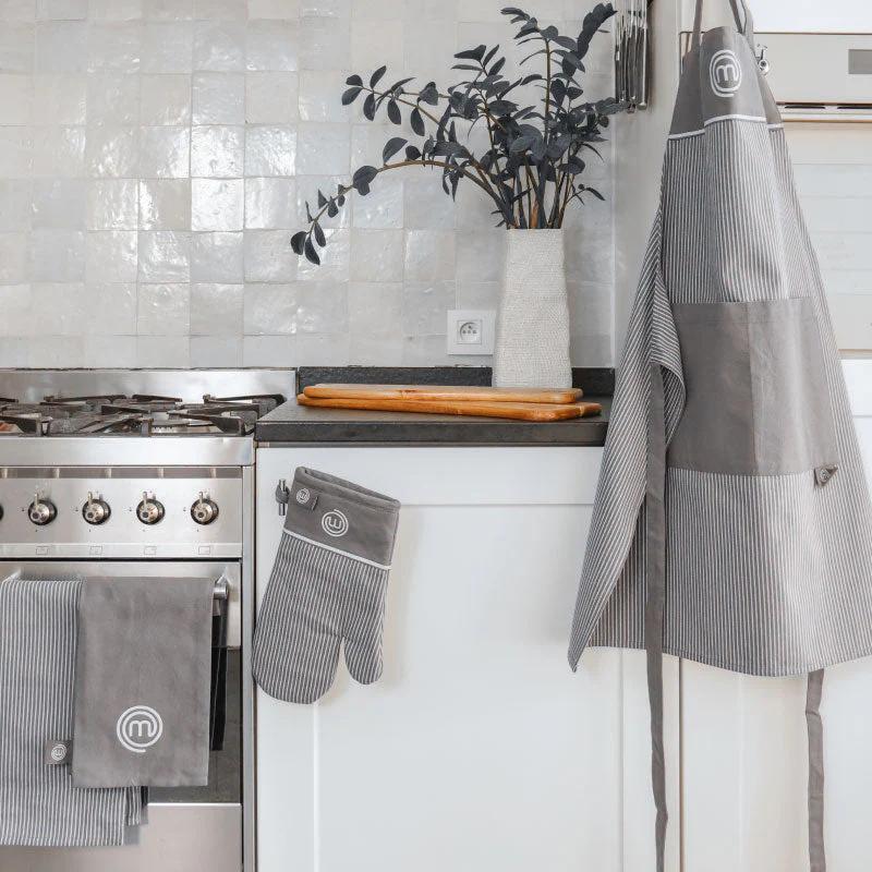 Kinnaste klassikaline triibuline disain lisab köögile elegantse ilme ning sobib suurepäraselt nii traditsioonilisema kui ka kaasaegse sisekujundusega koju. Mõlemal kindal on ka tikitud MasterChefi logo ning praktiline riputusaas, mis teeb hoiustamise lihtsaks ja mugavaks.