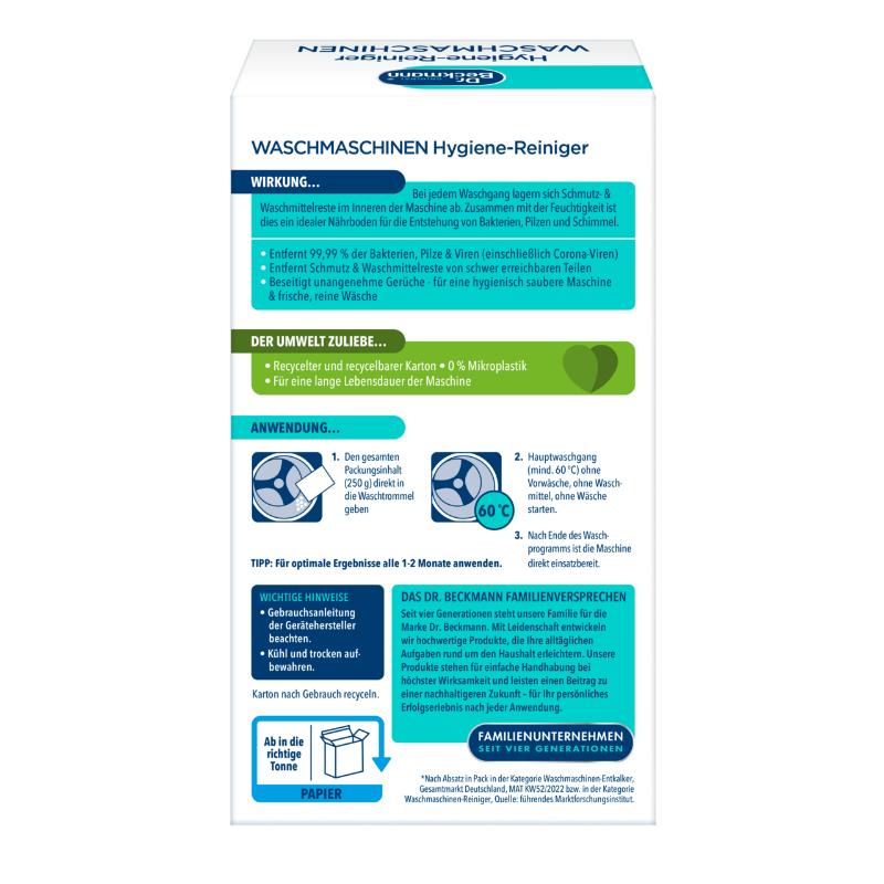 Dr. Beckmann pesumasinapuhastusvahend mitte ainult ei puhasta teie seadet, vaid eemaldab usaldusväärselt 99,99% bakteritest, seentest ja viirustest, kõrvaldades samal ajal ebameeldivad lõhnad.